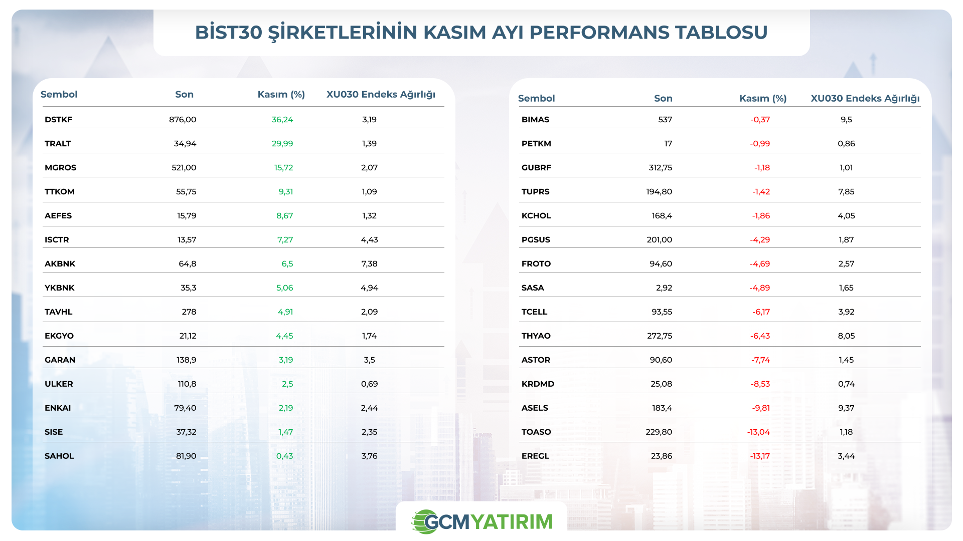 Kasım ayı şirket performanslarında karışık seyir gündemi meşgul etti. Kasım ayı boyunca en iyi performans sergileyenler DSTKF, TRALT ve MGROS olurken en kötü performans sergileyen şirketler EREGL, TOASO ve ASELS olarak öne çıktı.