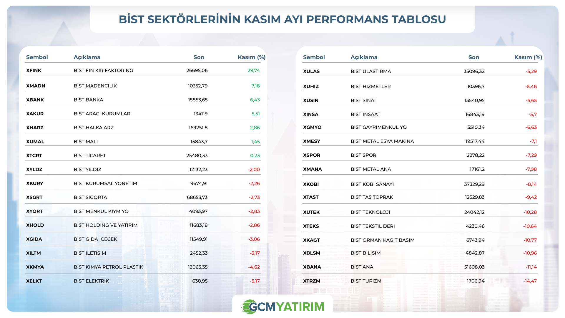 Sektör görünümlerinde Kasım ayında genel olarak negatif seyrin ön planda olduğu görülmektedir. Ana sektör endekslerine bakıldığında XBANK %6,43 yükselişle pozitif ayrışırken XUSIN %-5,65, XHOLD %-2,86 ve XUHIZ %-5,46 tarafında negatif fiyatlamanın öne çıktığı görülmektedir.