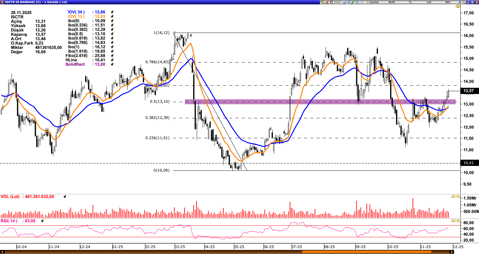 ISCTR: Son süreçte 13,10 seviyesi üzerinde kalıcı olamayarak geri çekilme yaşayan ISCTR, yakaladığı pozitif ivmeyle birlikte 13,10 seviyesi üzerinde fiyatlamalar sergilemektedir. Hareketin devamında 13,82 seviyesi takip edilirken aşılması durumunda 14,83 direncine yönelik ataklar gündeme gelebilir. Olası baskılanmalarda 13,10 ve 34 – 13 günlük ortalamalar (12,86 – 12,93) bölgesi kritik destek bölgesi konumunda yer almaktadır. Kırılması durumunda geri çekilme eğilimi derinleşebilir.