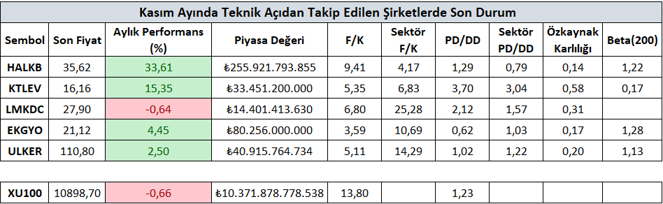Kasım ayına yönelik paylaşmış olduğumuz şirketlerin ilgili ay sergilediği performanslara ulaşacağınız tablo aşağıdaki gibidir.