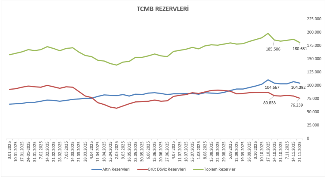 Rezervler tarafına bakıldığında ise Ekim ayının son haftasından 21 Kasım ile biten haftaya kadarki süreçte altın rezervlerinde 1,17 milyar dolar artış yaşanırken döviz rezervlerinde 4,14 milyar dolarlık azalış dikkat çekmektedir. Toplam rezervler ise bu dönemde 2,96 milyar dolarlık azalış kaydetmiştir.