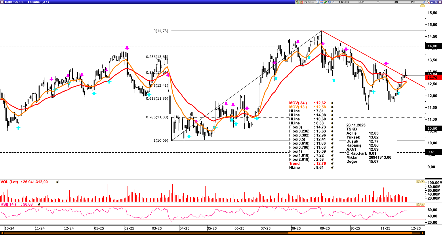 TSKB: Eylül ayından beri düşen trend içerisinde olan TSKB, yakaladığı ivmeyle birlikte düşen trend (12,76) üzerinde kapanış yapmayı başardı. Bu bölgenin üzerinde kalınması halinde pozitif görünüm desteklenerek 13,63 seviyesine doğru ivme devam edebilir. Olası yaşanabilecek baskılanmalarda 34 ve 13 günlük ortalamalar (12,62 – 12,58) bölgesi güçlü destek konumundadır. Bu bölgenin kırılması 11.86 seviyesinin gündeme gelme riskini artırabilir. Genel görüntü itibariyle 34 ve 13 günlük ortalamalar (12,62 – 12,58) üzerinde pozitif görünümün hakim olduğu söylenebilir.