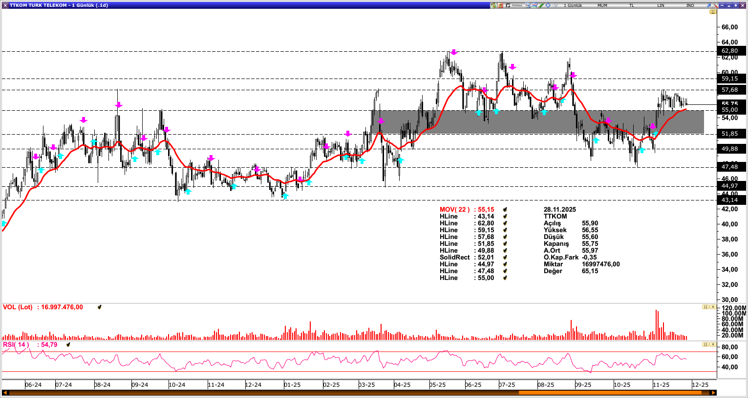 TTKOM: Son süreçte 22 günlük ortalamanın (55,15) aşılmasıyla pozitif ivme yakalayan TTKOM, ortalama üzerindeki seyrini sürdürmektedir. Hareketin devamında 57,68 seviyesi direnç olarak karşımıza çıkarken aşılması durumunda 62,80 seviyesine doğru hareket akışı devam edebilir. Olası baskılanmalarda 22 günlük ortalamanın bulunduğu 55,00 seviyesi güçlü destek olarak izlenebilir. Mevcut görünümde 55,00 – 51,85 bölgesi üzerinde iyimser beklenti ön planda yer almaktadır.