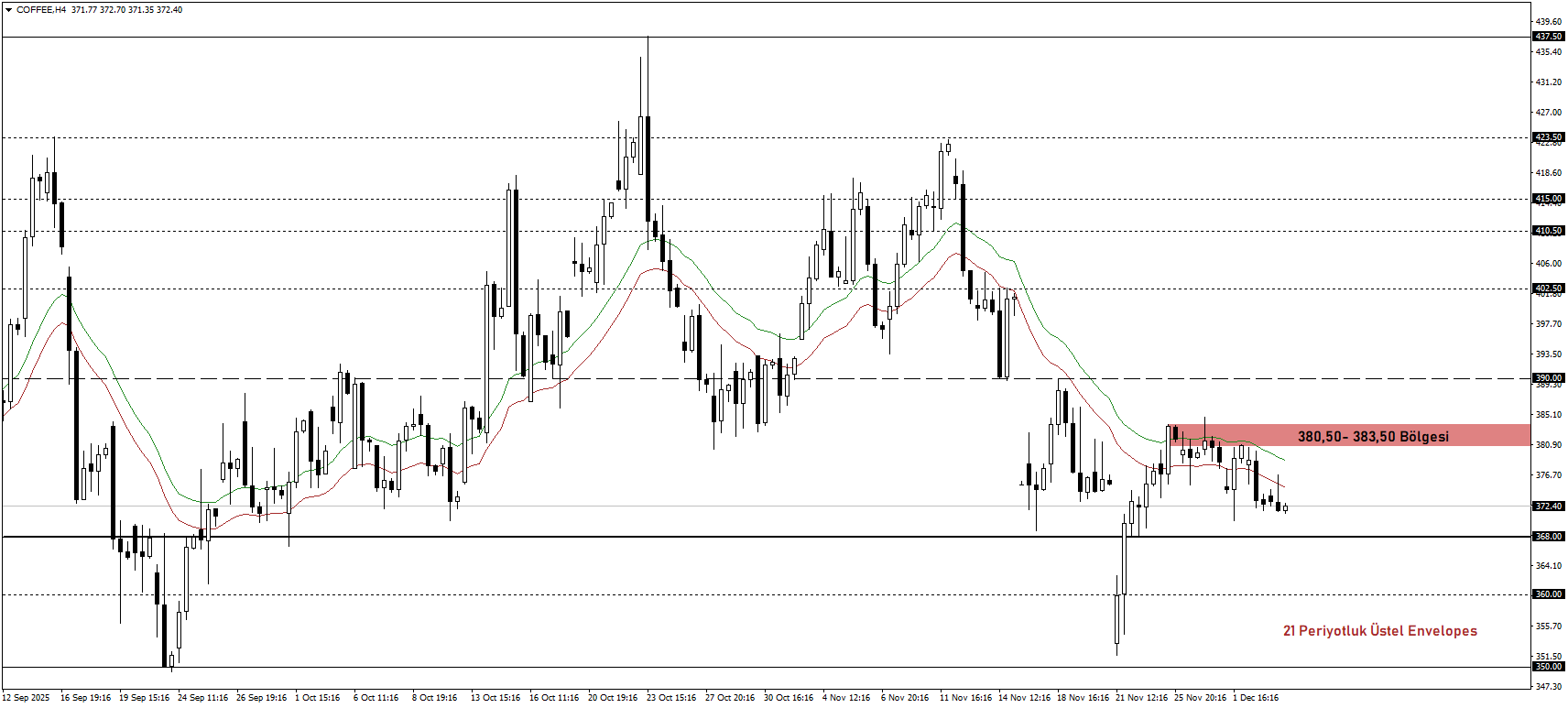 Yaz aylarından bu yana yatay bir görünüm sergileyen kahve fiyatları, 21 periyotluk üstel Envelopes ve 380,50–383,50 direnç bölgesinin altında kaldığı sürece baskı altında kalmaya devam ediyor.