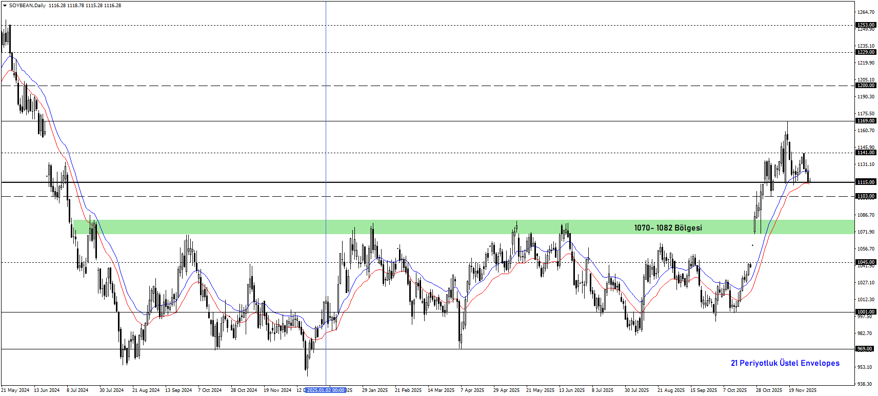 Yılın en yüksek seviyesi olan 1169 sonrası düzeltme hareketi içinde bulunan soya fasulyesi, 21 periyotluk üstel Envelopes ve 1115 desteği üzerinde kaldığı sürece pozitif teknik görünümünü koruyor.