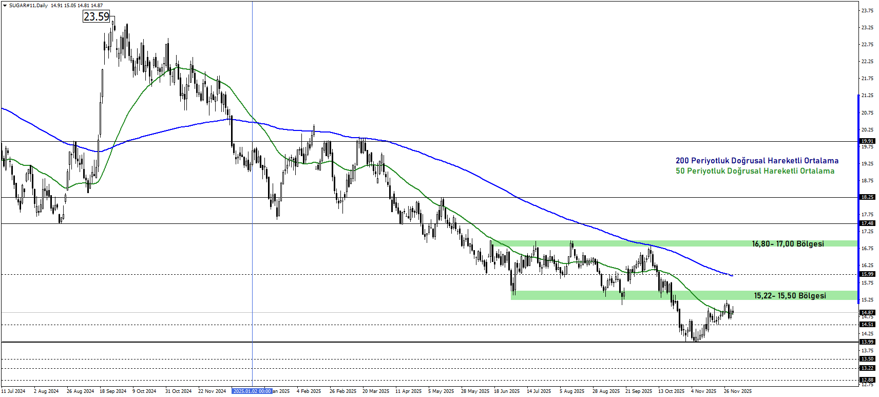 Şeker, 50 periyotluk doğrusal hareketli ortalamasını geçmiş olsa da kalıcı bir yükseliş trendinden söz etmek için henüz erken. 15,22–15,50 bölgesinin altında kaldığı sürece negatif fiyatlamanın devam etmesini bekliyoruz.
