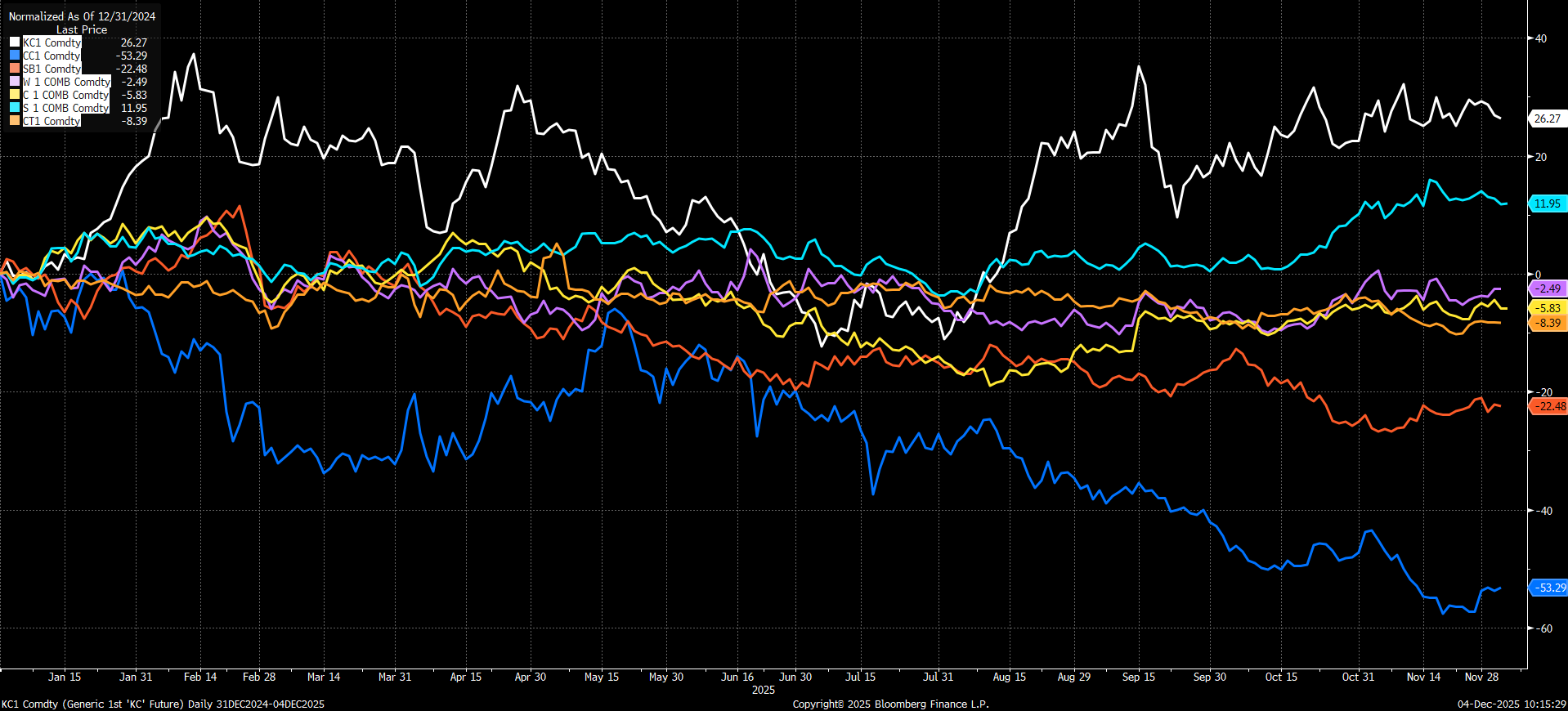 Kahve yılı güçlü talep ve kırılgan arz yapısı sayesinde bu yıl en iyi performansı sürdürürken, soya fasulyesi Çin alımları ve politik destekle son aylarda belirgin bir yükseliş trendi yakalıyor. Şeker tarafında küresel üretim artışı fiyatları baskılamaya devam ederken, buğdayda rekor seviyedeki küresel arz ve Karadeniz kaynaklı yüksek ihracat akışı fiyatları zayıf tutuyor. Kakao ise üretimdeki hızlı toparlanma, zayıf öğütme verileri ve azalan tedarik risklerinin etkisiyle yılın en sert düşüşünü yaşayan emtialardan biri olurken, mısır piyasasında güçlü küresel stoklar ve arz fazlasına rağmen teslimat kaynaklı sıkışıklıkların yarattığı kırılgan bir fiyat dengesi dikkat çekiyor. Pamukta ise küresel ve ABD üretimindeki yukarı yönlü revizyonların yarattığı arz rahatlaması, güçlü ihracat satışlarına rağmen fiyatların yılı negatif bölgede geçirmesine neden oluyor.