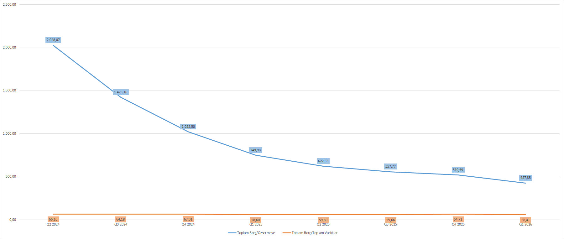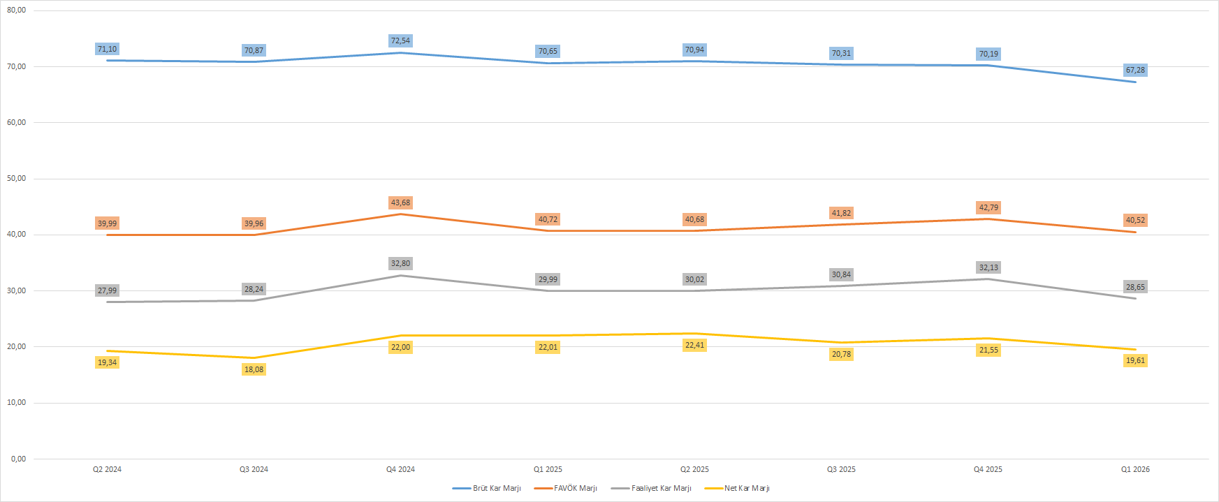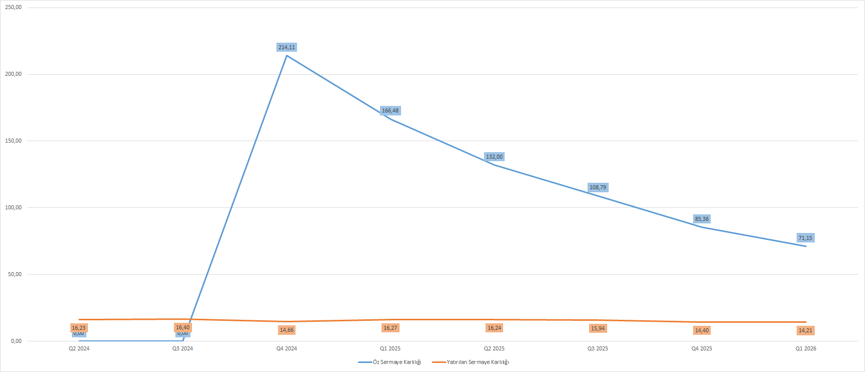 Aynı zamanda şirketin karlılık oranlarında da yavaşlama eğilimi izlendi. Mali 2026 yılı birinci çeyreklik dönemde öz sermaye karlılığı %57 oranında soğumayla, %71,15 oranında karşımıza çıktı. Yatırılan sermaye karlılığı (ROIC) %12,6 oranında gerileyerek, %14,21 oranında elde edildi.