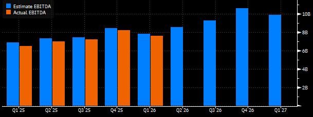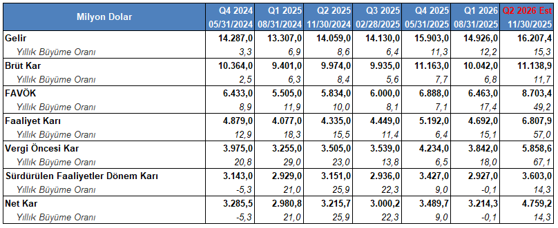 FAVÖK’ün 8,52 milyar Dolar tutarında kaydedilmesi düşünülüyor. En yüksek beklenti 8,84 milyar Dolar ve en düşük beklenti 8,27 milyar Dolar ile yer alıyor. Piyasa beklentisinin karşılanması halinde, FAVÖK yıldan yıla %49,2 oranında artış yaşayabilir.