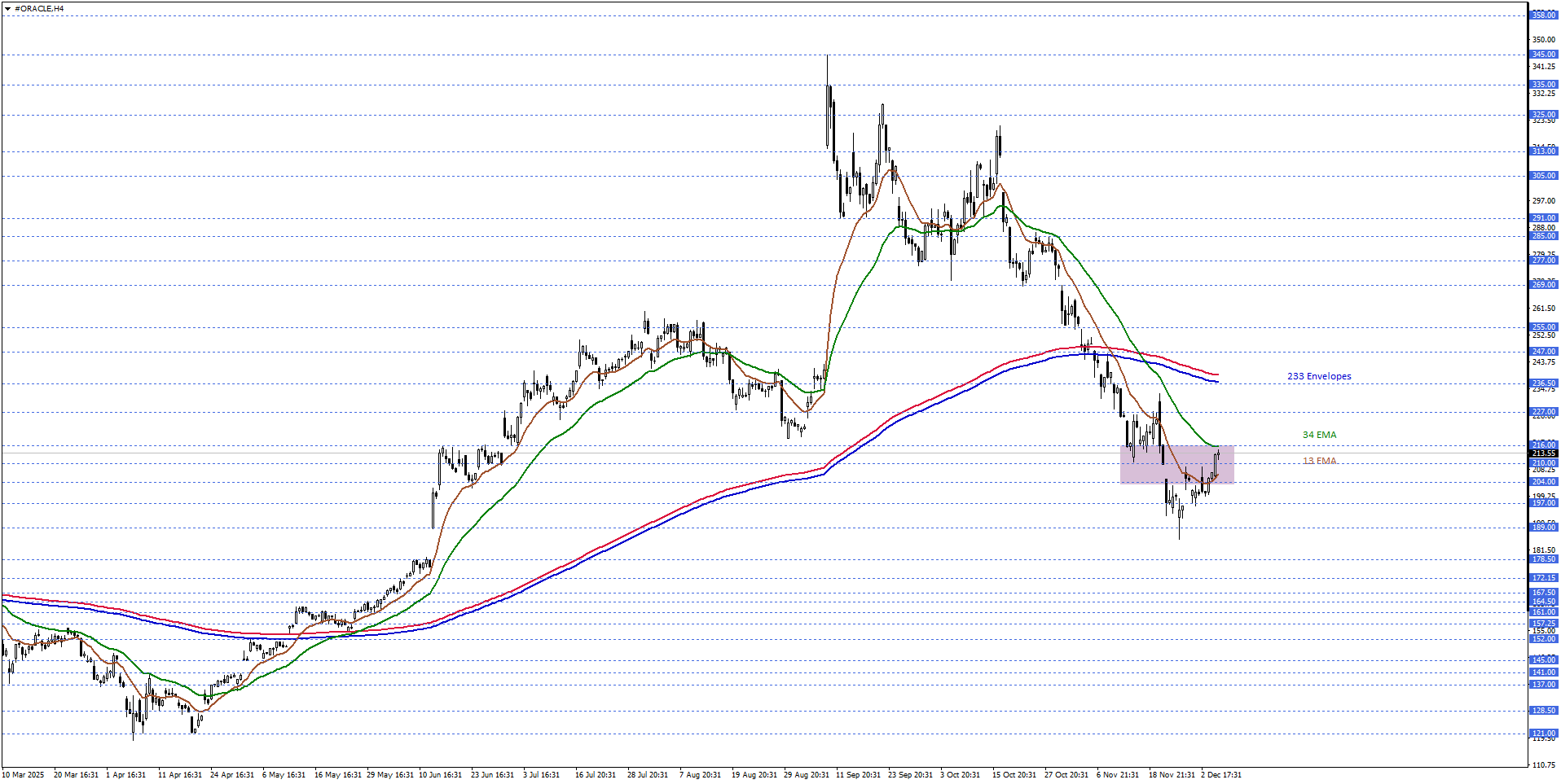 Oracle hisse fiyatını kısa vadede teknik açıdan değerlendirdiğimizde 13 ve 34 periyotluk üstel hareketli ortalamaların desteklediği 204,00 – 216,00 bölgesini takip etmekteyiz. Hisse fiyatı kısa vadede 204,00 - 216,00 bölgesinde hareket ettiği sürece karar aşaması senaryosu takip edilebilir.