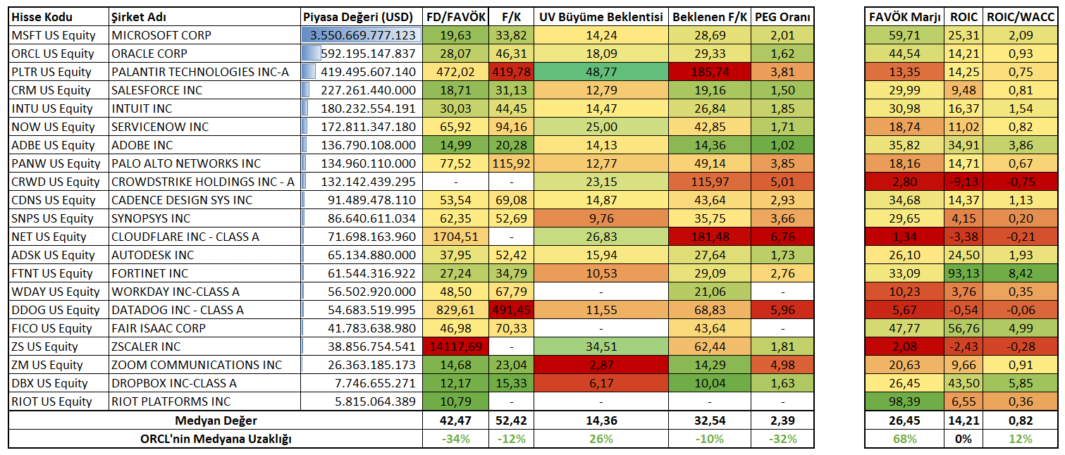 Şirketin firma değeri / FAVÖK oranı 28,07 çarpana sahipken; cari fiyat / kazanç oranı 46,31 oranında bulunuyor. Şirkete yönelik uzun vadeli büyüme beklentisi %18,09 ile benzerlerinin oluşturduğu medyan değerin üzerinde yer alıyor. Şirketin beklenen F/K oranı da 29,33 ile yine medyan değerden yukarıda bulunuyor. Oracle’ın PEG oranı 1,62 ile benzerlerinin altında bulunuyor. Bu değerlerin, medyan değere göre konumunu ele aldığımızda, şirketin benzerlerine kıyasla düşük çarpanlara sahip olduğu ve piyasa tarafından uzun vadeli beklentilerin benzerlerinden daha olumlu bakıldığı söylenebilir.