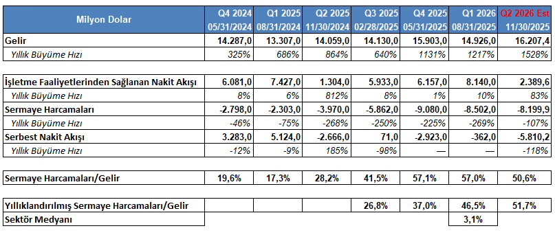 Oracle, yapay zeka bağlantılı diğer şirketler gibi, son dönemde sermaye harcamalarını yüksek oranda artırıyor. Bir önceki çeyrekte sermaye harcamalarını %225 oranında artıran şirket, bu çeyrekte %269 oranında artırdı. Son 2 çeyrekte nakit çıkışı yaşan şirketin, mali ikinci çeyreklik dönemde yüksek sermaye harcamalarından kaynaklı olarak 5,8 milyar Dolar nakit çıkışı yaşaması bekleniyor.