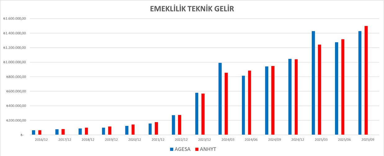 Emeklilik Teknik Gelir branşında AGESA ve ANHYT firmalarının 2016 ilk çeyreğinden 2025 3 çeyreğe kadar olan 38 dönemlik Emeklilik Teknik Bölüm büyümelerinin ortalamalarına bakıldığında AGESA’nın %10.1 ortalama büyüme gösterdiği ve ANHYT’ın ortalama büyüme gösterdiği %9.5 tespit edilmiştir. Diğer taraftan son 7 çeyrektir AGESA’nın %17 ortalama büyüdüğü ve ANHYT’ın %16 ortalama büyüdüğü gözlemlenmektedir.