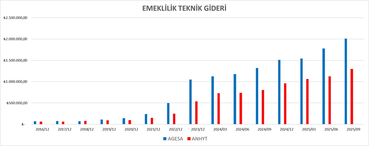 Emeklilik Teknik Gider branşında AGESA ve ANHYT firmalarının 2016 ilk çeyreğinden 2025 3 çeyreğe kadar olan 38 dönemlik Emeklilik Teknik Gider büyümelerinin ortalamalarına bakıldığından AGESA’nın her çeyreği için ortalama %11 büyüme gösterdiği ve ANHYT’nin ortalama %10 büyüme gösterdiği tespit edilmiştir. Diğer taraftan son 7 çeyrektir AGESA’nın ortalama büyümesi yaklaşık %10, ANHYT’nin ortalama büyümesi yaklaşık %14 olduğu gözlemlenmektedir.