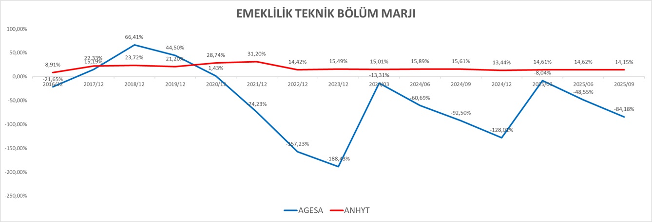 Emeklilik Teknik Bölüm Marjı incelendiğinde 2016 yılından itibaren 38 çeyreklik dönem ortalamasında AGESA’nın ortalama -%22 marjı, ANHYT’nin %21’lik marjı olduğu görülmektedir. Son 7 çeyrek ortalamaları dikkate alındığında AGESA -%62,18 ve ANHYT’ın %14,76’lık marj ortalaması oluşmuştur. ANHYT firması marjlarda dikkat çekmektedir.