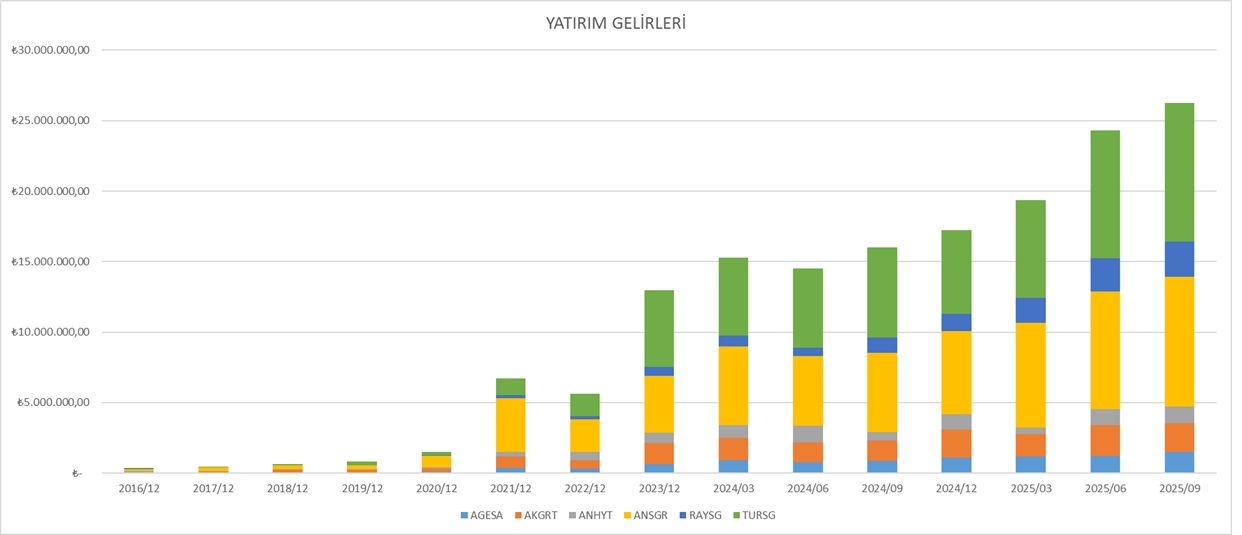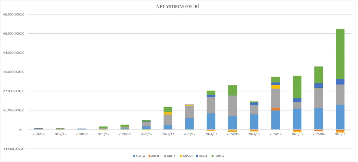Yatırım Geliri branşında 2016 ilk çeyreğinden 2025 3 çeyreğe kadar olan 38 dönemlik Yatırım Gelirleri büyümelerinin ortalamalarına bakıldığında AGESA %26, AKGRT %21, ANHYT %26, ANSGR %28, RAYSG %41 ve her çeyreklikte TURSG’nin %37 ortalama büyüdüğü gözlemlenmiştir. Diğer taraftan son 7 çeyrektir AGESA %13, AKGRT %7, ANHYT %26, ANSGR %13, RAYSG %27 ve ortalama TURSG’nin %9 büyüdüğü gözlemlenmiştir.