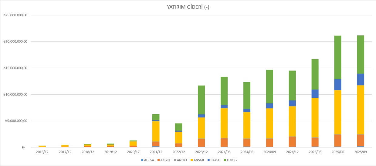 Yatırım Giderleri incelediğinde ise 38 çeyreklik büyüme ortalamalarının AGESA %59, AKGRT %20, ANHYT %13, ANSGR %27, RAYSG %37 ve TURSG’nin %36 oluştuğu görülmektedir.