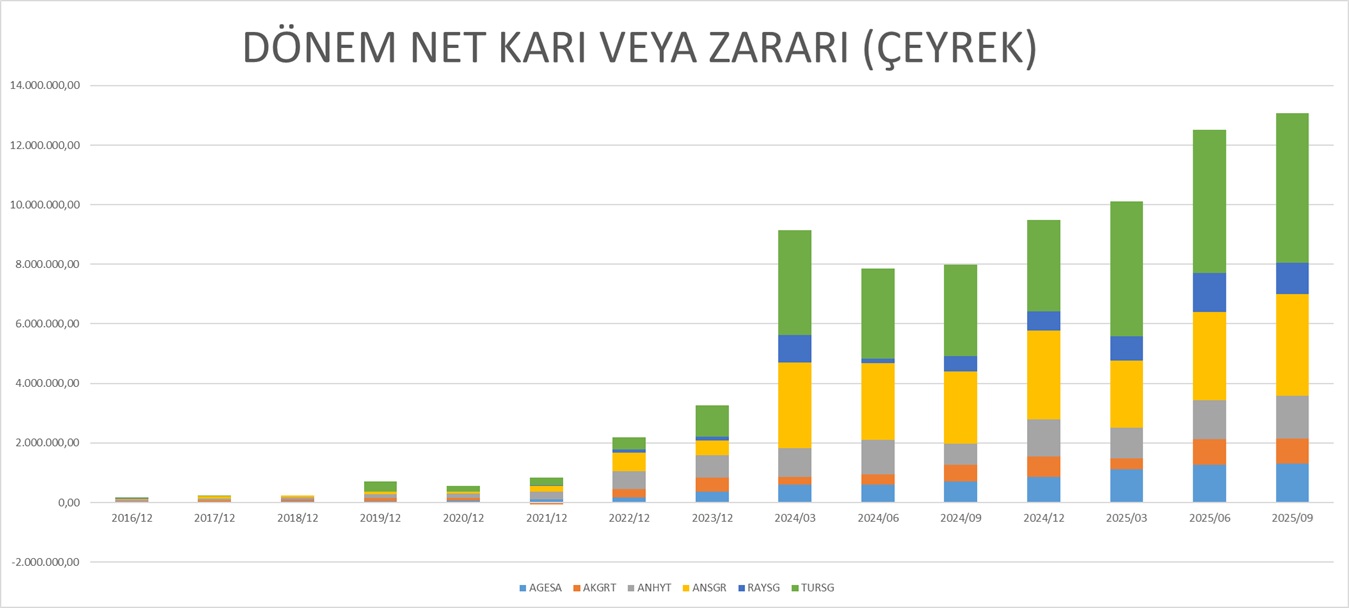 Dönem Net Karı veya Zararı branşını 2016 ilk çeyrek ve 2025 3 çeyrek dönemlerinde incelendiğinde TURSG'nin %94 ortalamayla önde olduğunu görmekteyiz. Ardından gelen RAYSG %36, ANSG %32, AKGRT %27, AGESA %20 ve ANHYT'nin %15 ile firmaları takip ettiğini görmekteyiz.
