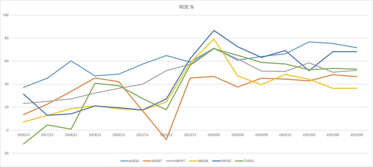 Sigorta şirketlerinin özkaynak karlılıkları (ROE) incelendiğinde pandemi dönemine rast gelen dönemlerde özkaynak karlılıkları azalırken daha sonraki dönemlerde artmaya başlamış olup 2024 yılından itibaren daha stabil hale geldiği gözlenmektedir. 38 dönemlik çeyrekler üzerinden yıllıklandırılmış özkaynak getirilerinin ortalaması AGESA %58, AKGRT %30, ANHYT %41, ANSGR %26, RAYSG %32 ve TURSG’nin %30’larda oluştuğu görülmektedir.