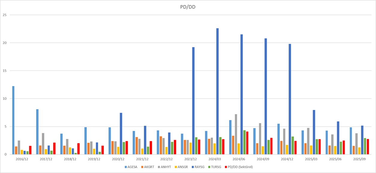 Sigorta şirketlerinin göreceli değerleme yaklaşımlarından Fiyat/Kazanç oranları incelediğinde RAYSG’nin dönemler itibariyle her zaman sektör ortalamasının üzerinde olduğu görülmektedir. Diğer firmaların ise genelde sektörün altında kaldığı gözlenirken TURSG’nin zaman zaman F/K sektörün görece hafif üzerinde yada görece hafif altında kaldığı görülmektedir. Yine sektörün PD/DD oranı incelendiğinde ise F/K’da ki benzer durum ortaya çıkmaktadır.