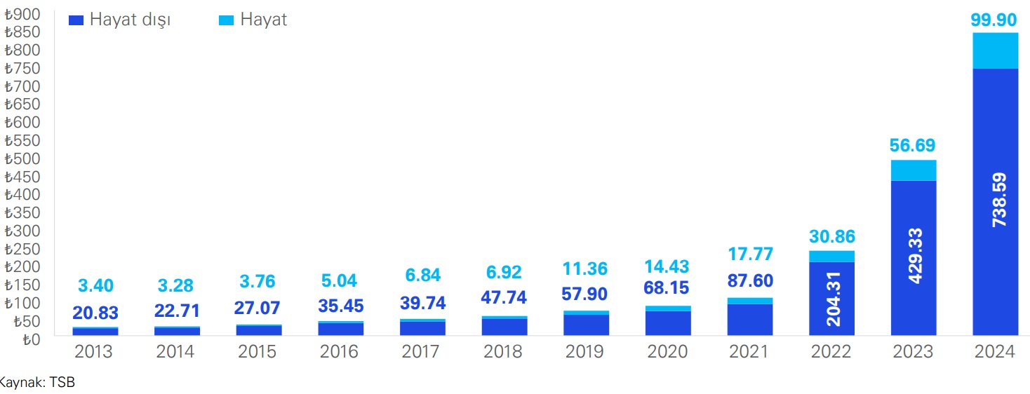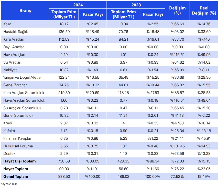 2024 yılı verilerine göre, Türkiye’de üretilen 838,5 milyar TL’lik toplam prim hacminin 738,59 milyar TL’lik kısmı hayat dışı sigorta branşlarından sağlandı. Bu alanda 2024 yılında kaydedilen reel artış oranı yüzde 19,15 olarak dikkat çekti. Branşlar özelinde bir değerlendirme yapıldığında, 2024 yılında Kara Araçları Sorumluluk branşı 219,3 milyar TL prim üretimi gerçekleştirerek 2023 yılındaki yüzde 27,53 olan pazar payını yüzde 29,69’a yükseltti. Pazar payını belirgin şekilde artıran diğer branşlar Hastalık-Sağlık ile Yangın ve Doğal Afetler oldu. Reel büyüme performansı en yüksek olan branşlar yüzde 15,91 ile Finansal Korumalar, yüzde 13,18 ile Kefalet, yüzde 7,40 ile Kara Araçları ve yüzde 2,22 ile Genel Sorumluluk sigortaları olarak sıralandı.