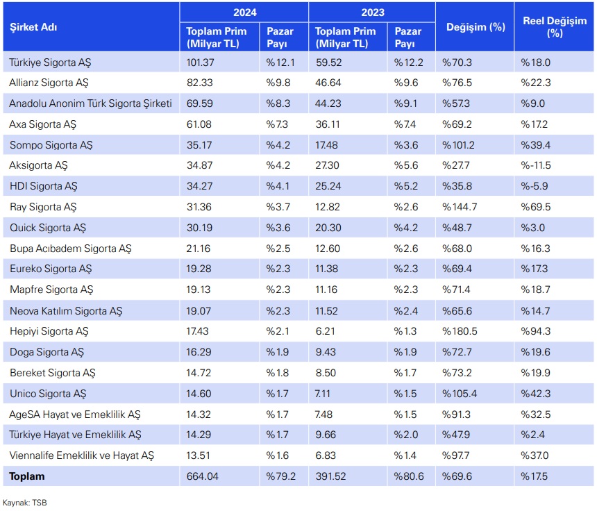 Türk sigorta sektöründe 2024 yılı verileri, pazarın belirgin bir yoğunlaşma eğilimi içinde olduğunu göstermektedir. İlk 20 şirket toplam prim üretiminin %79,2’sini gerçekleştirerek sektördeki hakim konumlarını sürdürmüştür. Türkiye Sigorta A.Ş., %18’lik reel büyümeye rağmen pazar payında küçük bir düşüş yaşamıştır. Sektörde en dikkat çekici büyüme performansını %94,3 ile Hepiyi Sigorta AŞ, %69,5 ile Ray Sigorta AŞ ve %42,3 ile Unico Sigorta AŞ reel olarak göstermiştir. Buna karşılık, Aksigorta AŞ %11,5 ve HDI Sigorta AŞ %5,9 oranında reel küçülme kaydetmiştir.
