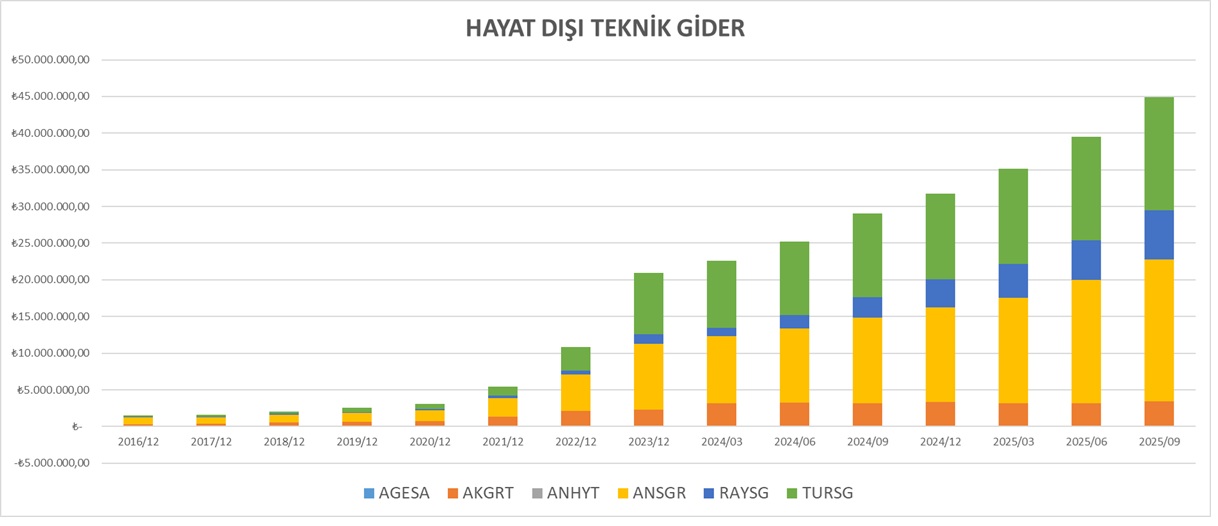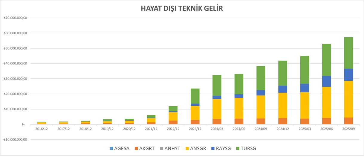 Borsa İstanbul’da Sigortacılık Sektöründe işlem gören firmaların hayat dışı teknik gelir gelişimi incelendiğinde büyümenin COVİD ve Deprem sonrasında aşırı büyüdüğü gözlenmektedir. Diğer taraftan Hayat Dışı Gelir branşında TURSG, RAYSG, ANSGR ve AKGRT firmalarının önde olduğu görülmekle birlikte TURSG ve ANSGR’nin büyüklük olarak ön plana çıktığı görülmektedir. 2016 ilk çeyreğinden 2025 3 çeyreğe kadar olan 38 dönemlik Hayat Dışı Gelir büyümelerinin ortalamalarına bakıldığında TURSG’nin %24, RAYSG %15 ve ANSGR’nin de yaklaşık %11 büyüdüğü görülmektedir. Diğer taraftan son 7 çeyrektir TURSG’nin yaklaşık %12, RAYSG’nin %26,7 ve ANSGR’nin ise %15,5 büyüdüğü gözlenmektedir.