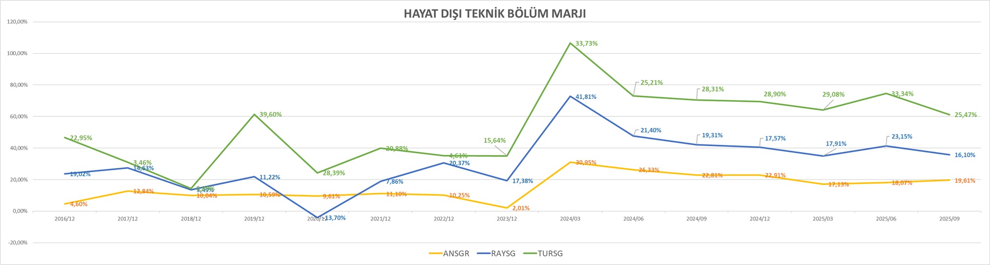 Hayat Dışı Teknik Bölüm marjı incelediğinde TURSG’nin marjlarda öne çıktığı görülmektedir. 2016 yılından itibaren 38 çeyreklik dönem ortalamasında TURSG’nin %17 marjı, RAYSG’nin %15’lik marjı ve ANSGR’nin yaklaşık %13’lük marjı olduğu görülmektedir. Son 7 çeyrek ortalamaları dikkate alındığında TURSG %29.15’lik marjı ile dikkat çekmektedir. RAYSG’nin ise %22,46’lık ve ANSGR %22,55’lik marj ortalaması oluşmuştur. TURSG’nin 4 çeyrekte de marjlarını koruması beklenmektedir.