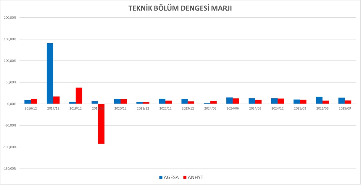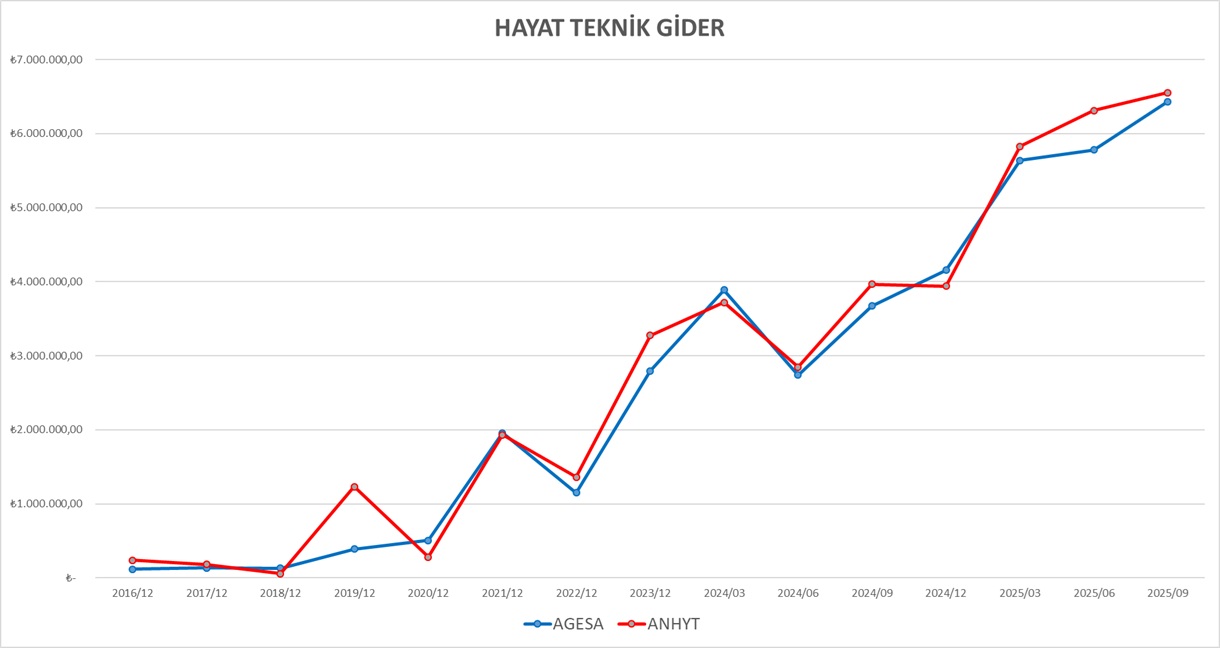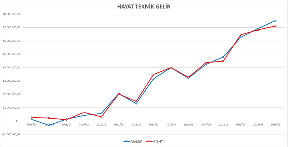 Hayat Teknik Gelir branşında AGESA ve ANHYT firmalarının faaliyette olduğu görülmektedir. 2016 ilk çeyreğinden 2025 3 çeyreğe kadar olan 38 dönemlik Hayat Teknik Gelir büyümelerinin ortalamalarına bakıldığında AGESA’nın her çeyreklik için ortalama %11 büyüme gösterdiği ve ANHYT’nin ortalama %25 büyüme gösterdiği tespit edilmiştir. Diğer taraftan son 7 çeyrektir AGESA’nın ortalama büyümesi yaklaşık %14, ANHYT’nin ortalama büyümesi %12 olduğu gözlemlenmektedir.