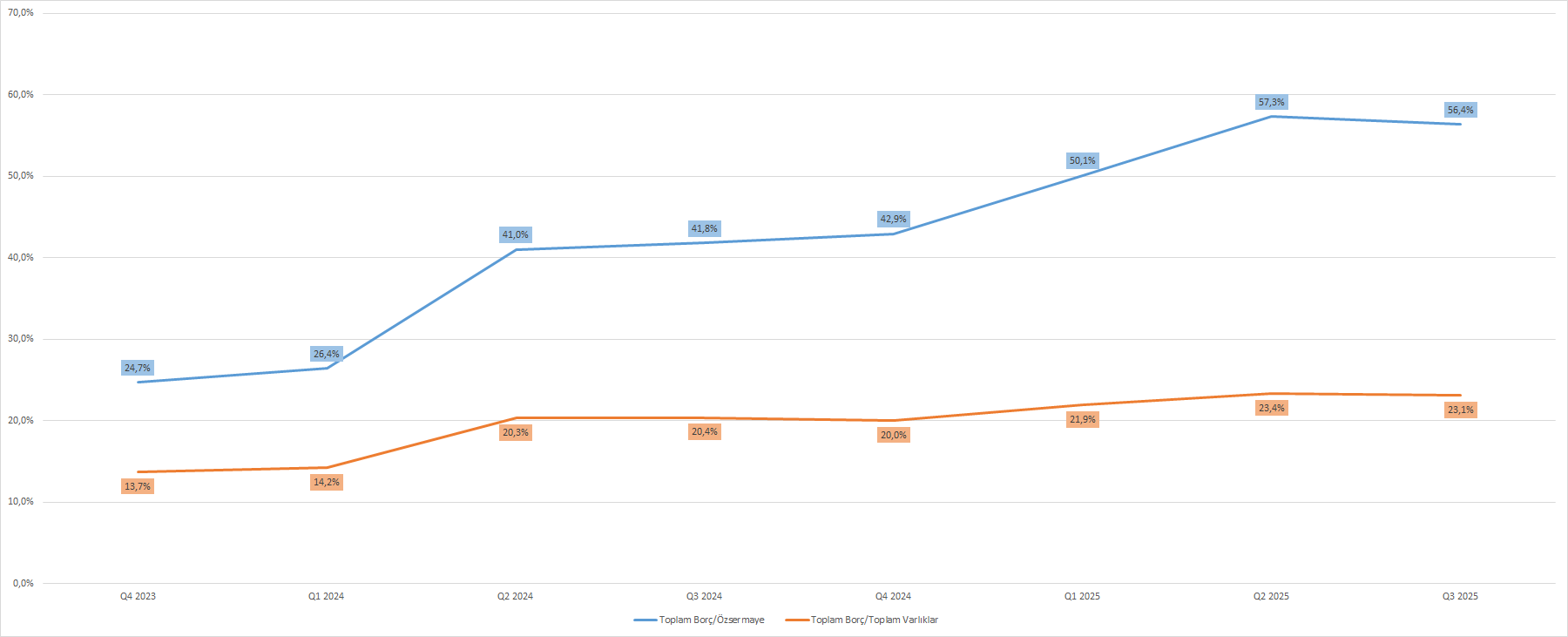 Borçluluk yapısını ele aldığımızda, Adobe bu dönemde bilançonun aktif tarafında hem de pasif tarafında yer alan kalemlerine göre borçlarını artırmayı sürdürdü. Öz sermayeye oranla toplam borçlar %56,4 oranına yükselirken, geçen yılın aynı dönemine göre bu oran %34,9 büyüdü. Toplam varlıklara oranla toplam borçlar %23,1 oranına artarken, bu oran yıllık bazda %13,3 yükseliş yaşadı.