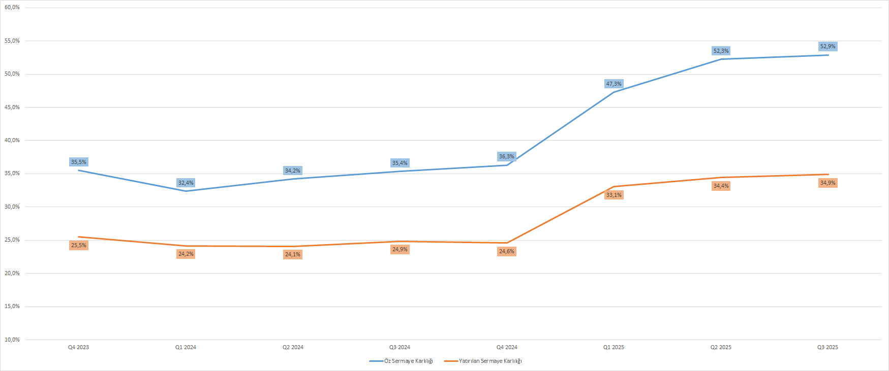 Adobe’un mali 2025 yılı üçüncü çeyreklik döneminde karlılık oranlarındaki artış eğilimi ise devam etti. Öz sermaye karlılığı yıllık bazda %49,6 oranında artışla %52,87 oranına yükseldi. Yatırılan sermaye karlılığı (ROIC) ise %40,4’lük büyümeyle %34,91 oranında karşımıza çıktı.
