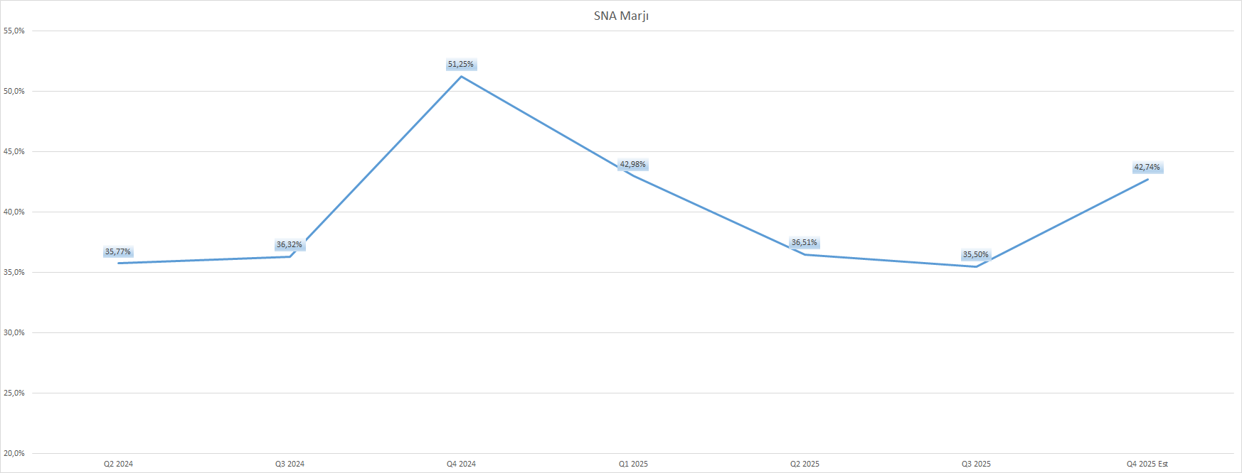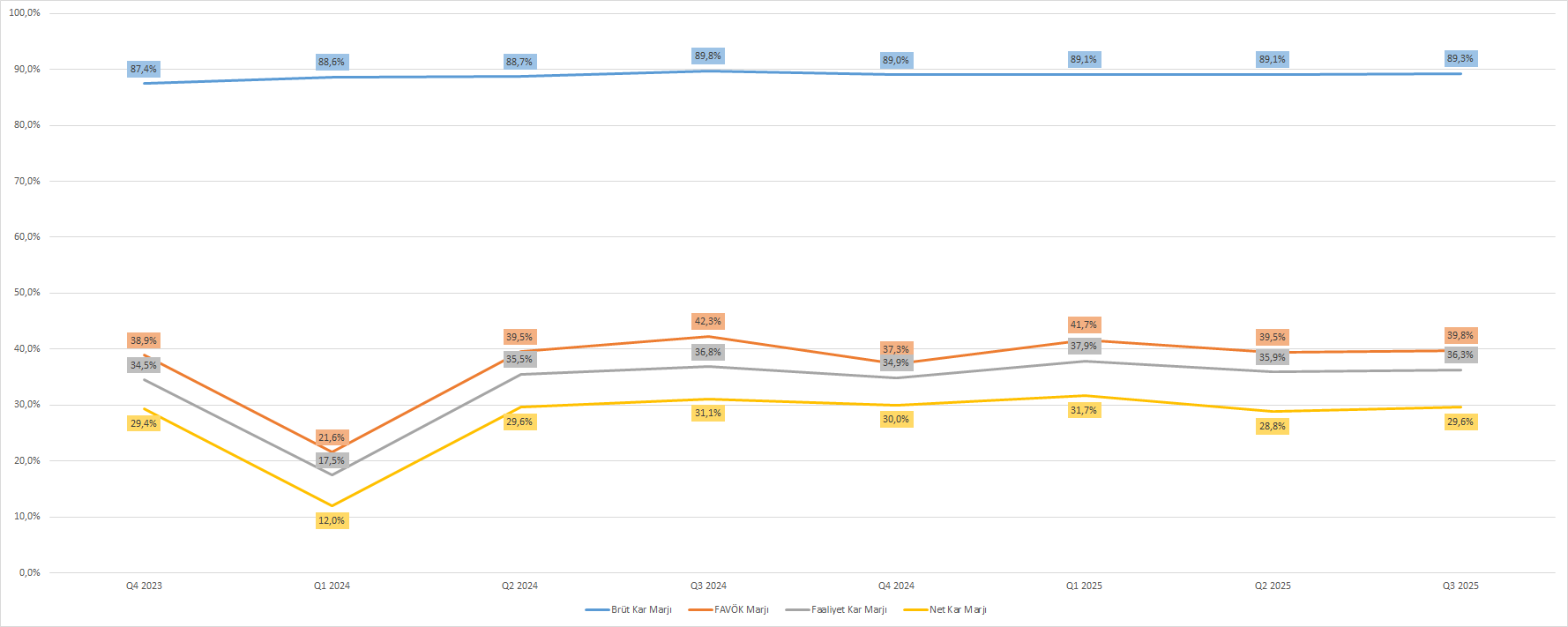 Şirketin yıllıklandırılmış verilerle FAVÖK marjı %35,82 oranında gerçekleşti ve bu oran benzerlerinin medyanı üzerinde bir değere işaret ediyor. İlerleyen tablolarda bu durumu görebilirsiniz.