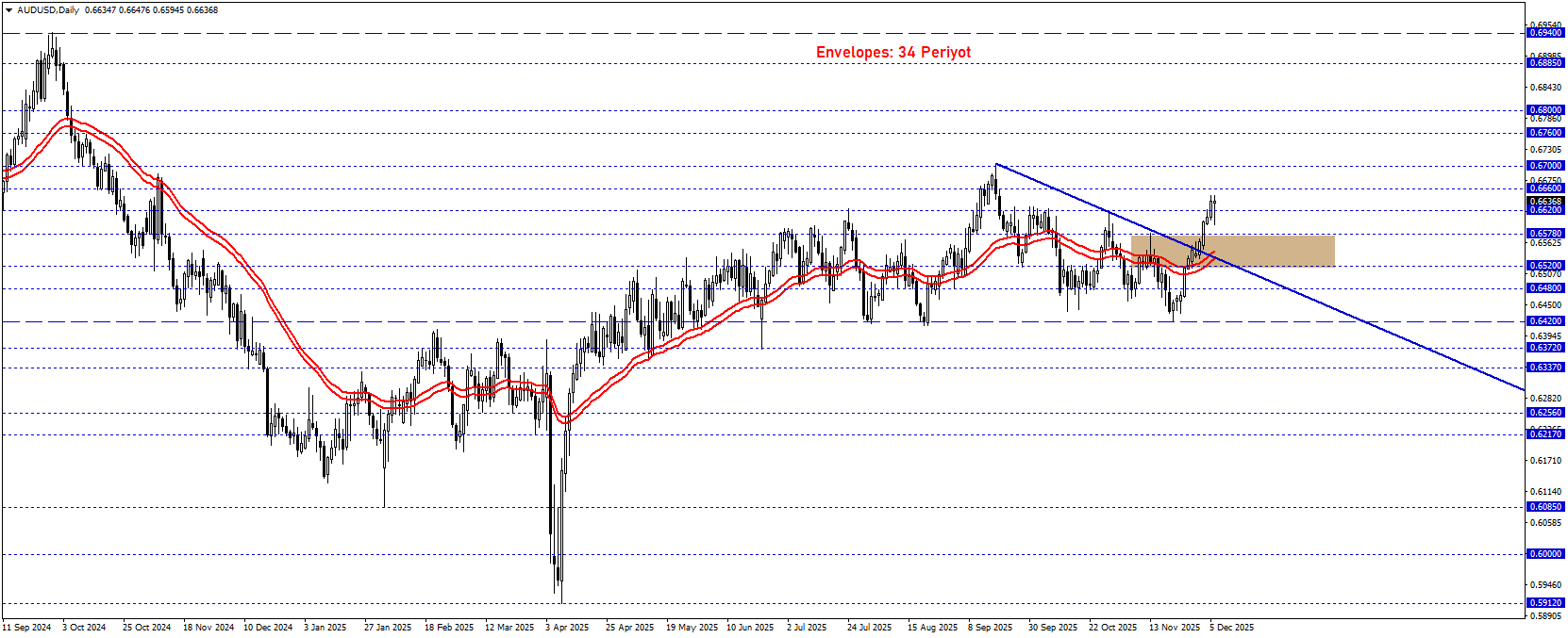 AUDUSD Paritesi, pozitif görünümünü korumaya devam ediyor. Envelopes göstergesinin de destek ayağı olduğu 0,6578 – 0,6520 bölgesi ve üzerinde kalıcılık sağlandığı sürece, yukarı yönlü hareketin devam ederek 0,6940 seviyesine kadar yükselme ihtimali güç kazanabilir. 0,6700 seviyesinin aşılması ise yükselişe ivme kazandırabilir. Öte yandan, 0,6578 – 0,6520 bölgesinin altına sarkılması halinde satış baskısı artabilir ve 0,6420 seviyesinin yeniden test edilme olasılığı gündeme gelebilir.