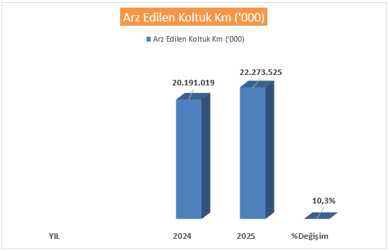 - Toplam Arz Edilen Koltuk Km (AKK), Kasım 2024 döneminde 20,19 milyar iken, 2025 yılının Kasım ayında %10,3 artarak 22,27 milyar olarak gerçekleşmiştir.