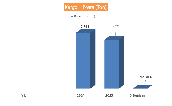- Kasım 2024 döneminde kargo + posta 5.743 bin ton iken, Kasım 2025’te -12,30% azalışla 5.039 bin ton olarak gerçekleşti.
