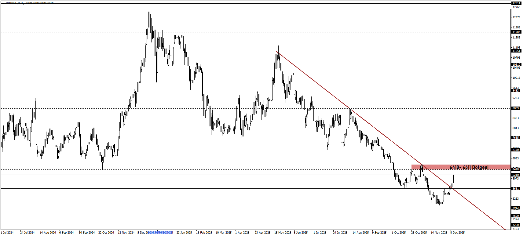 Kakao Mayıs ayındaki kısa süreli toparlanma denemesinin ardından güçlü bir satış baskısına girerek o tarihten Aralık başına kadar yaklaşık %50 değer kaybetti. Trend çizgisinin kırılması ve alımların artmasına rağmen, test edilmesini beklediğimiz 6418–6611 bölgesinin altında kalınması, negatif teknik görünümün korunmasına neden oluyor.