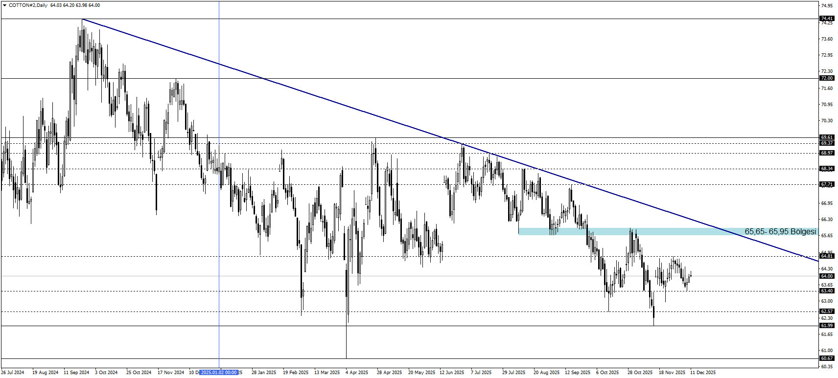 2024 yılından bu yana ağırlıklı olarak aşağı yönlü bir yapı izleyen pamuk, 2025 yılı genelinde geniş bir bant içinde yatay-seyirli bir konsolidasyon sürecine girmiş durumda. Yılbaşına göre hala negatif bölgede olan pamuk fiyatlarında, mevcut teknik görünüm altında baskının bir süre daha korunmasını bekliyoruz.