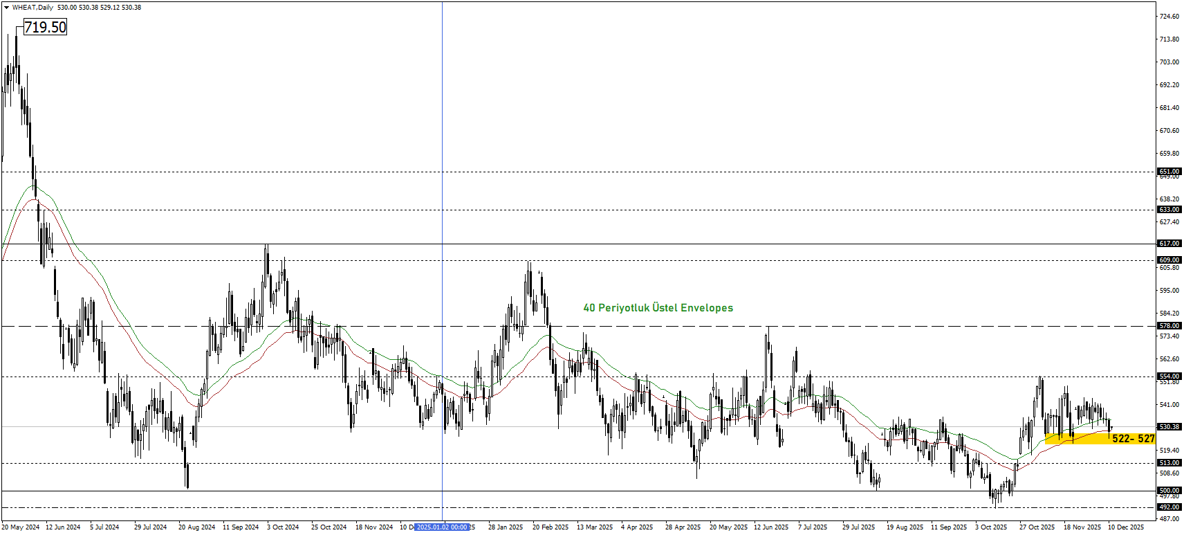 492 dip seviyesinden gelen toparlanma sonrası buğday, Envelopes (40) ile 522–527 bölgesinin üzerinde pozitif görünümünü koruyor ve fiyatlar bu bölgede sıkışmış durumda.