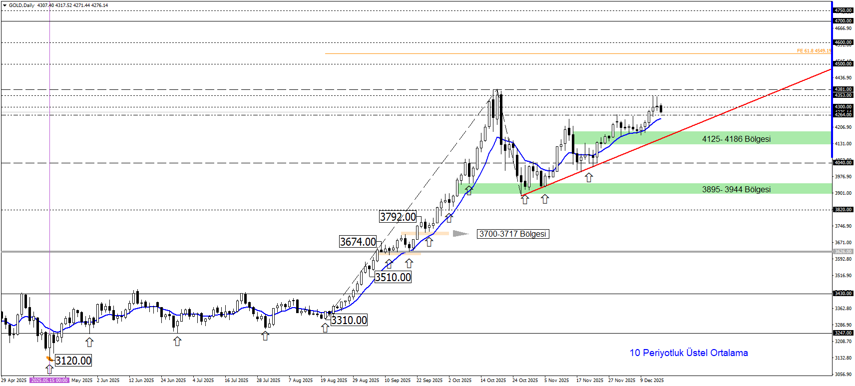 Alternatif Senaryo: 4264 seviyesinin kaybı ile fiyatların trend çizgisi ve 4125–4186 bandına doğru geri çekilmesi gündeme gelebilir. Bu bölgenin de kırılması durumunda 4040 seviyesi izleniyor olacak.