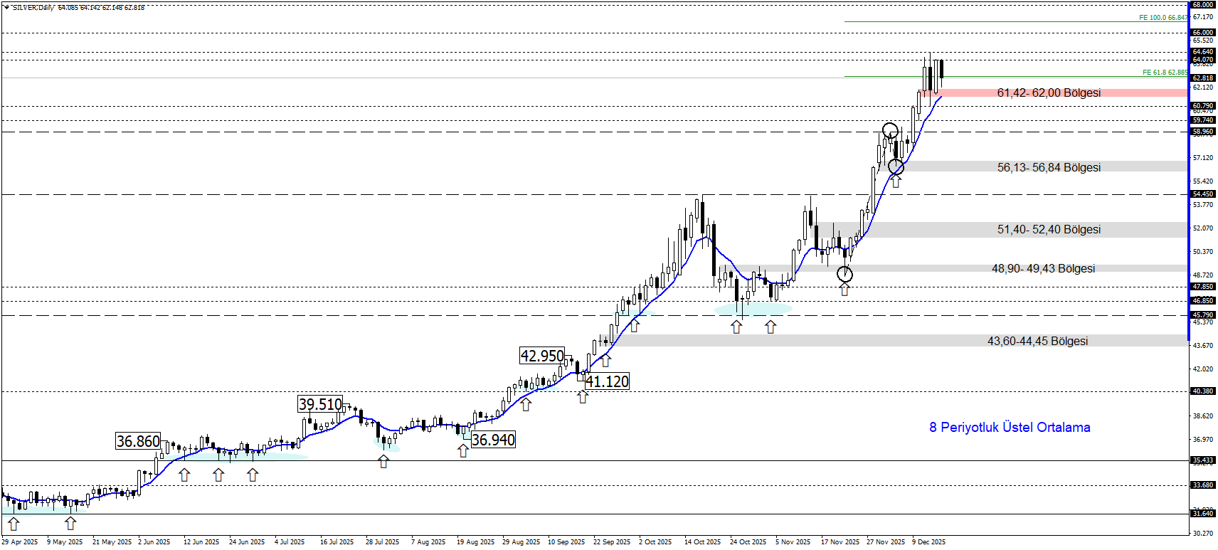 Gümüş, 8 periyotluk üstel ortalamanın üzerinde kalarak yükseliş eğilimini koruyor. Tarihi zirve bölgesine yakın seyirde kısa vadeli sıkışma izleniyor.