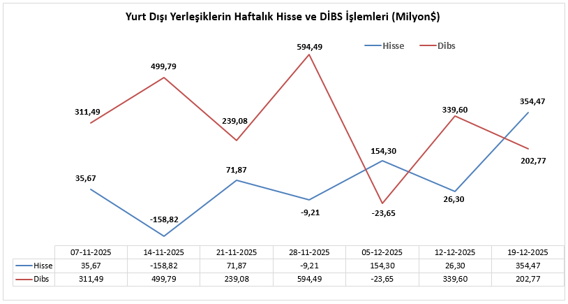 15 - 19 Aralık haftasında yurt dışında yerleşik kişilerin piyasa fiyatı ve kur hareketlerinden arındırılmış hisse senetleri net değişimi 354 milyon 470 bin dolar olarak gerçekleşirken yurt dışında yerleşik kişilerin piyasa fiyatı ve kur hareketlerinden arındırılmış DİBS (Kesin Alım) net değişimi 202 milyon 770 bin dolar olarak gerçekleşti.