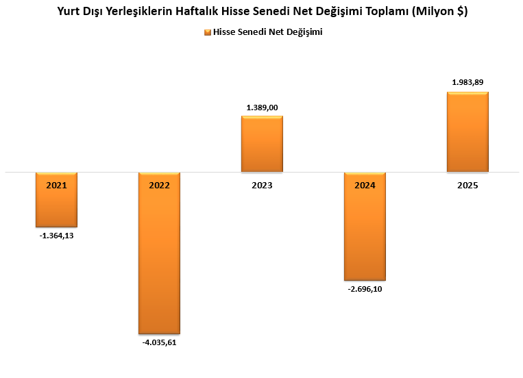 Yıllık bazda hisse senedi net değişimlerine ayrıca bakıldığında ise yabancıların 2021 ve 2022 yılında hisse senetlerinde satım gerçekleştirdiği, 2023 yılında alım tarafında yer aldıkları görülmektedir. 2024 yılının ise 2021 ve 2022’ye benzer şekilde net satım ile negatif tarafta sonlandığı görülmüştür. Diğer yandan 2025 yılının başından itibaren 19 Aralık ile biten haftayla birlikte hisse senetlerinde 1,98 milyar dolarlık alım gerçekleştiği görülmektedir.