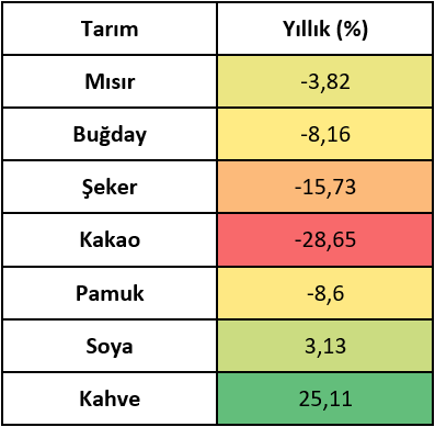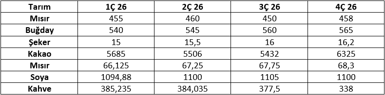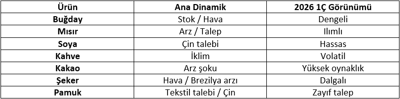 Tahıl sınıfı stok ve hava koşulları nedeniyle dengeli bir görünü sunuyor. Soya ve Pamuk tarafında ise Çin talebine bağımlılık kırılganlık yaratmaya devam ediyor. Kahve ve Kakao hava koşullarına karşı oynak kalmaya devam edebilir. Şekerde ise özellikle Brezilya arzı, bölgedeki hava koşullarına bağlı olarak yön arayışında olacak.