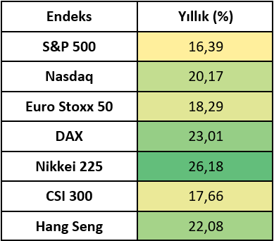 Endeksler genel olarak pozitif seyrederken, bölgesel ayrışmalar takip edildi. Özellikle tematik ayrışmalar da ön plandaydı. Avrupa endeksleri sanayi ve ihracat destekli bir toparlanma sağlarken, Çin ve Hong Kong yükselişleri politika beklentisiyle kırılgan toparlanmayı işaret etti. Yükselişin kalıcılığı, bölgesel büyüme ve politika desteğine bağlı olacak.