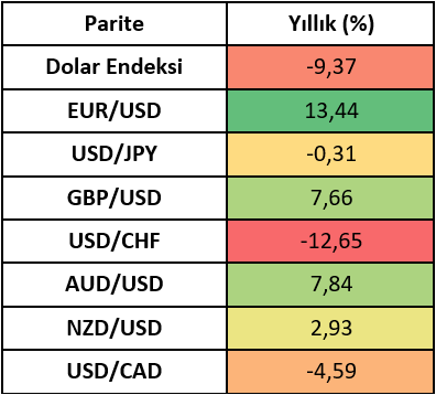 2025’te dolar genel olarak zayıflarken, diğer para birimlerinde belirgin ayrışmalar görüldü. Euro, Sterlin ve emtiaya hassas olan Yeni Zelanda ve Avustralya dolar gibi para birimleri dolar karşısında değer kazanırken, İsviçre Frangı güvenli liman talebiyle dikkat çekti.