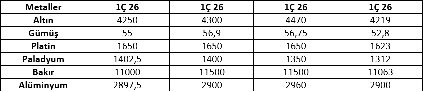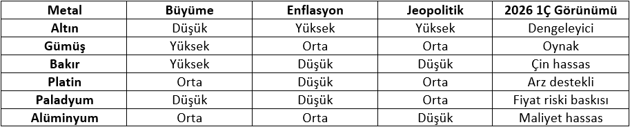 Altın katı hizmet enflasyonu ve jeopolitik risk hassasiyeti nedeniyle dengeleyici rolünü korurken, Gümüş büyüme beklentilerine duyarlılığı nedeniyle hala volatil bir görünüm sergileyebilir. Bakır ve alüminyum tarafında fiyatlama büyük ölçüde Çin büyümesi ve maliyet yönetimine bağlı kalabilir. Paladyum ise yapısal dönüşüm nedeniyle Platine kıyasla negatif ayrışma potansiyeli taşıyor.