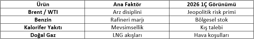 Petrol tarafında arz disiplini korunsa da, jeopolitik gelişmeler risk primi yaratıyor. Bu risklerin ilk çeyrekte ne kadarının çözüleceği önemli olacak. Benzin rafineri marjları ve bölgesel stok değişimlerine duyarlı kalıyor. Kalorifer yakıtı kış talebinden destek bulurken, Doğal gaz LNG akışı ve hava tahminlerine hassas olmaya devam ediyor.