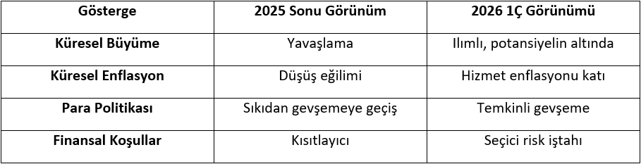 2026’ya girilirken küresel ekonomi, 2024–2025 döneminde uygulanan sıkı para politikalarının gecikmeli etkilerinin hissedildiği; buna karşın jeopolitik risklerin yüksek seyrettiği, ancak sert bir daralma riskinin sınırlı kaldığı bir denge noktasında bulunmaktadır. Küresel büyüme potansiyelin altında kalmaya devam ederken, önceki döneme kıyasla finansal piyasalardaki stresin azaldığı izlenmektedir.