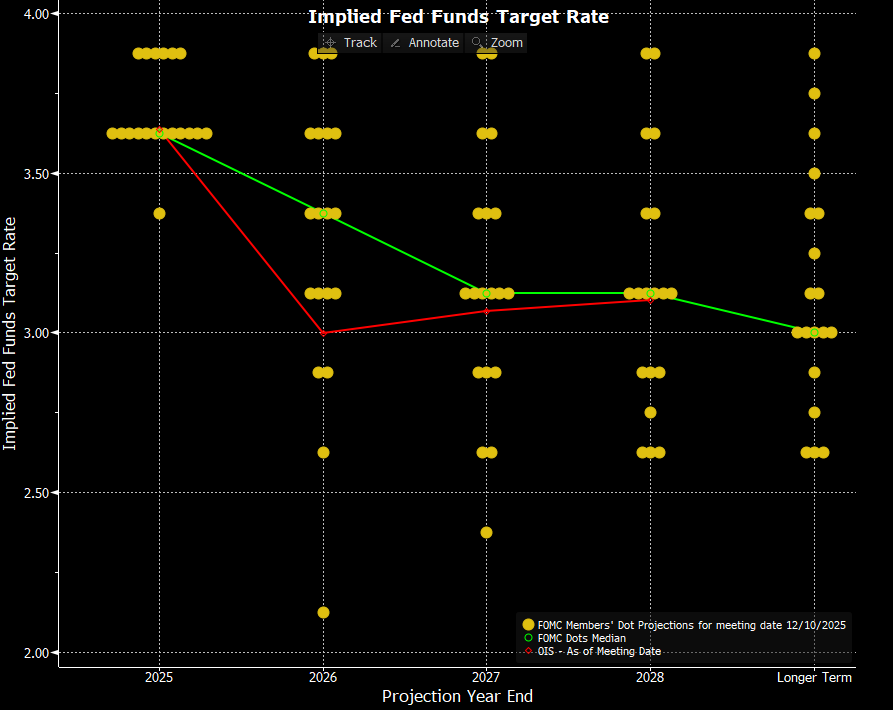 Konu merkez bankaları ve piyasa ayrışması olunca, Fed’i görsel olarak sunmakta fayda olacaktır. Yukarıdaki grafikte yeşil çizgi FOMC üyelerinin ilgili döneme ait faiz beklentilerini, kırmızı ise swap piyasalarında fiyatlanan faiz düzeylerini gösteriyor. 2026 yılına bakıldığında, iki kesim arasındaki makasın ciddi şekilde açıldığı görülebilir.