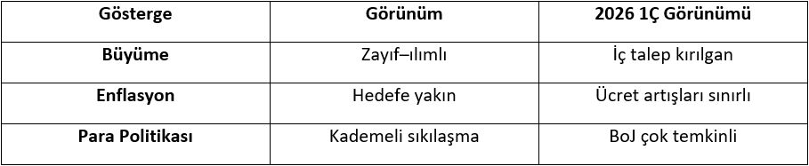 Enflasyon BoJ’un 2% hedefi etrafında seyrederken, fiyat artışları yoğun olarak kur kaynaklı oluyor. Bu da para politikasında temkinli duruşu zorunlu kılıyor. Ücret ve fiyat dengesinin henüz stabil olmaması, BoJ’un hızlı sıkılaşma sürecinin önüne geçiyor gibi görünüyor.